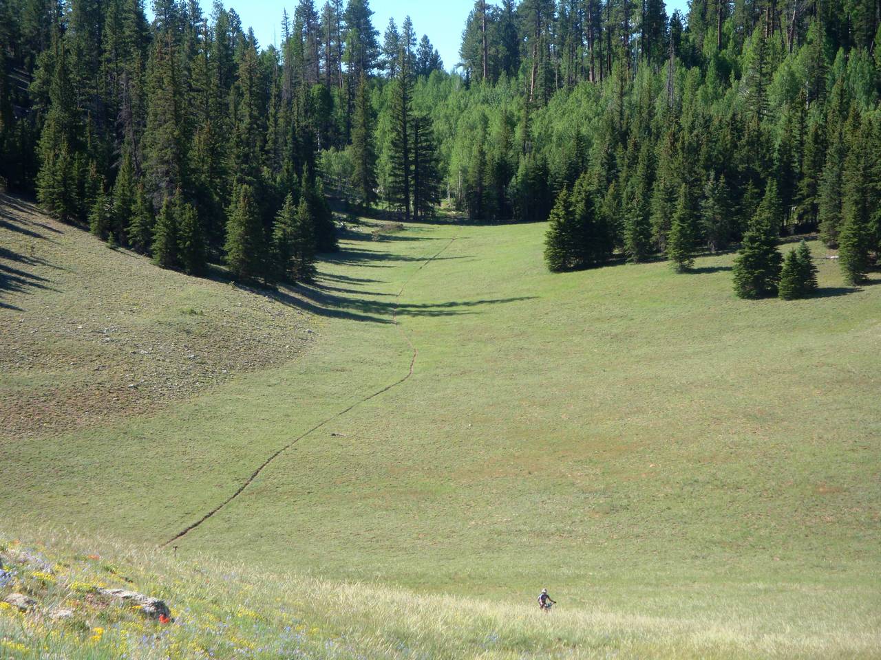 Feeling spent and week, stomach torn asunder; Chad throws some encouragement my way to make camp at the East Rim.....the singletrack through idyllic meadows buoyed my spirits.....